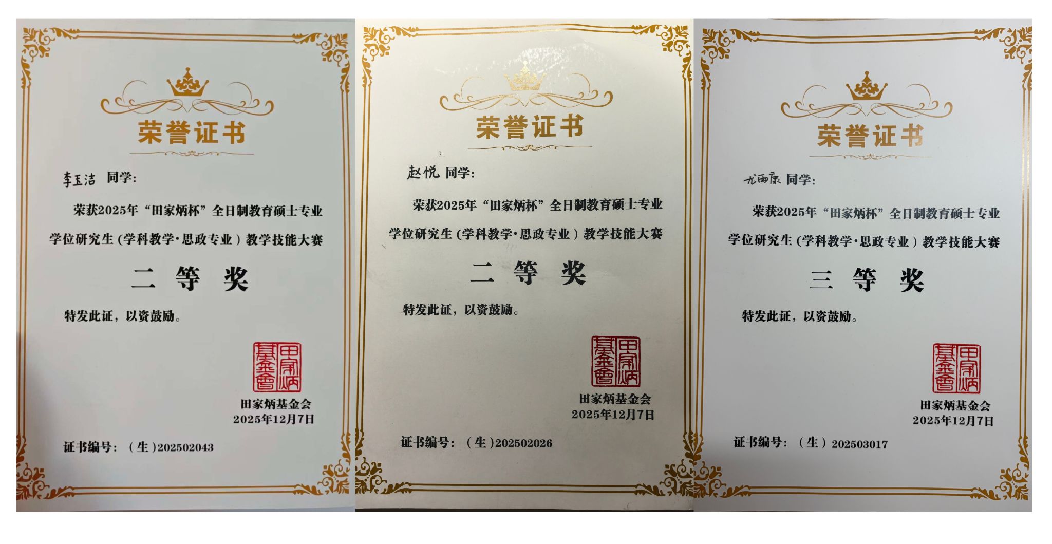 2025年12月5日至7日,由江西师范大学主办、田家炳基金会冠名支持的2025年全国“田家炳杯”全日制教育硕士专业学位研究生(学科教学·思政)教学技能大赛决赛在江西师范大学瑶湖校区圆满落幕。我校威廉希尔官网数据2024级学科教学(思政)专业研究生赵悦、李玉洁荣获二等奖,尤雨康同学荣获三等奖,指导教师何光辉、刘英荣获优秀指导教师奖。