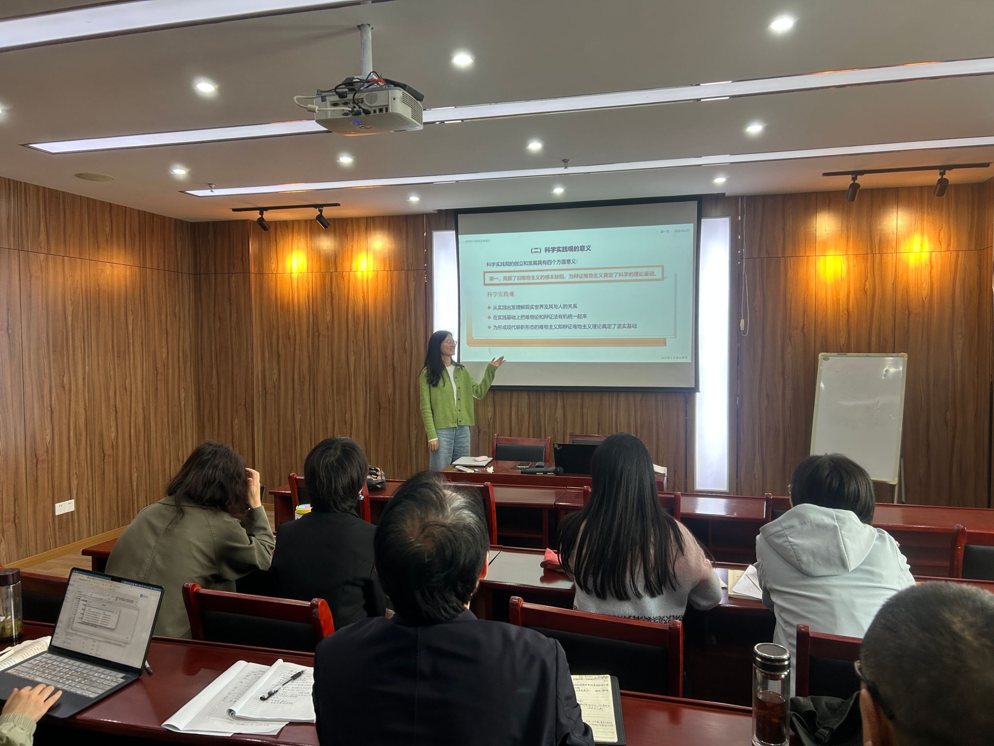 本次集体备课会上,主讲教师陈思敏围绕“科学实践观”作了教学分享。她强调了“科学实践观”在课程体系中的重要地位,并从中国和西方先哲们的实践思想出发,剖析了旧哲学未能科学把握实践本质的理论局限,进而系统阐释了马克思在《关于费尔巴哈的提纲》《德意志意识形态》中实现的革命性突破,梳理了科学实践观的形成脉络。与会教师对讲授内容进行了评议,并围绕理论阐述的内容处理和方式创新展开了讨论。大家一致认为要结合学生认知基础展开对概念的阐释,可借助情景创设等互动方式深化理论理解,并指出在梳理理论发展脉络时应结合时代背景,遵循规范表述,同时注意内容详略得当。